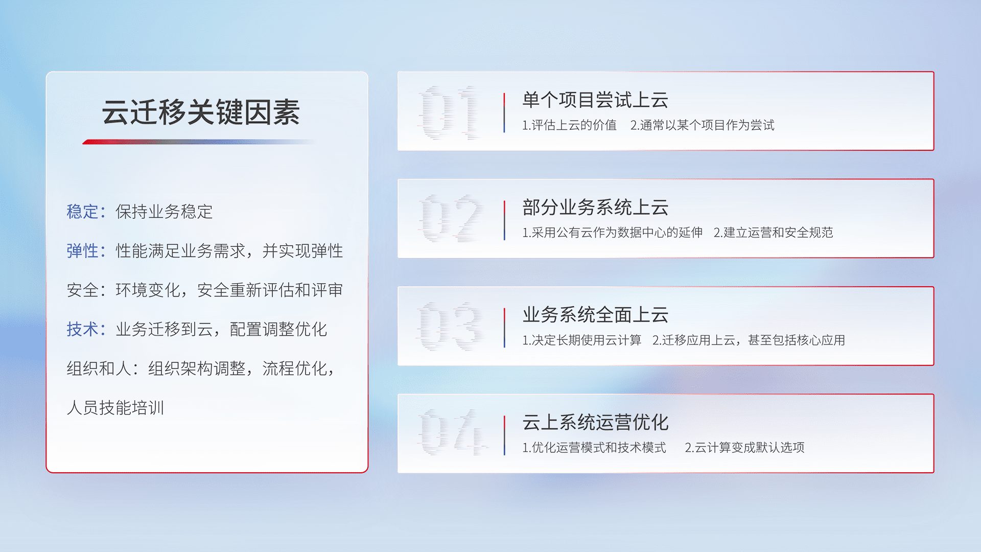 结合实际业务,,,,从规划设计、、、、云平台选型、、、、云原生改造、、数据迁移、、集成交付,,,迁移全过程为客户识别最佳上云路径,,,,做好风险识别管理,,,,设计网络架构、、、、身份权限、、安全审计合规、、、操作审计、、、日志审计、、、、监控告警策略、、、多站点容灾设计等,,对云上基础设施进行整体规划,,提升IT治理水平,,,以满足弹性、、、、高可用、、、、高性能的需求。。
