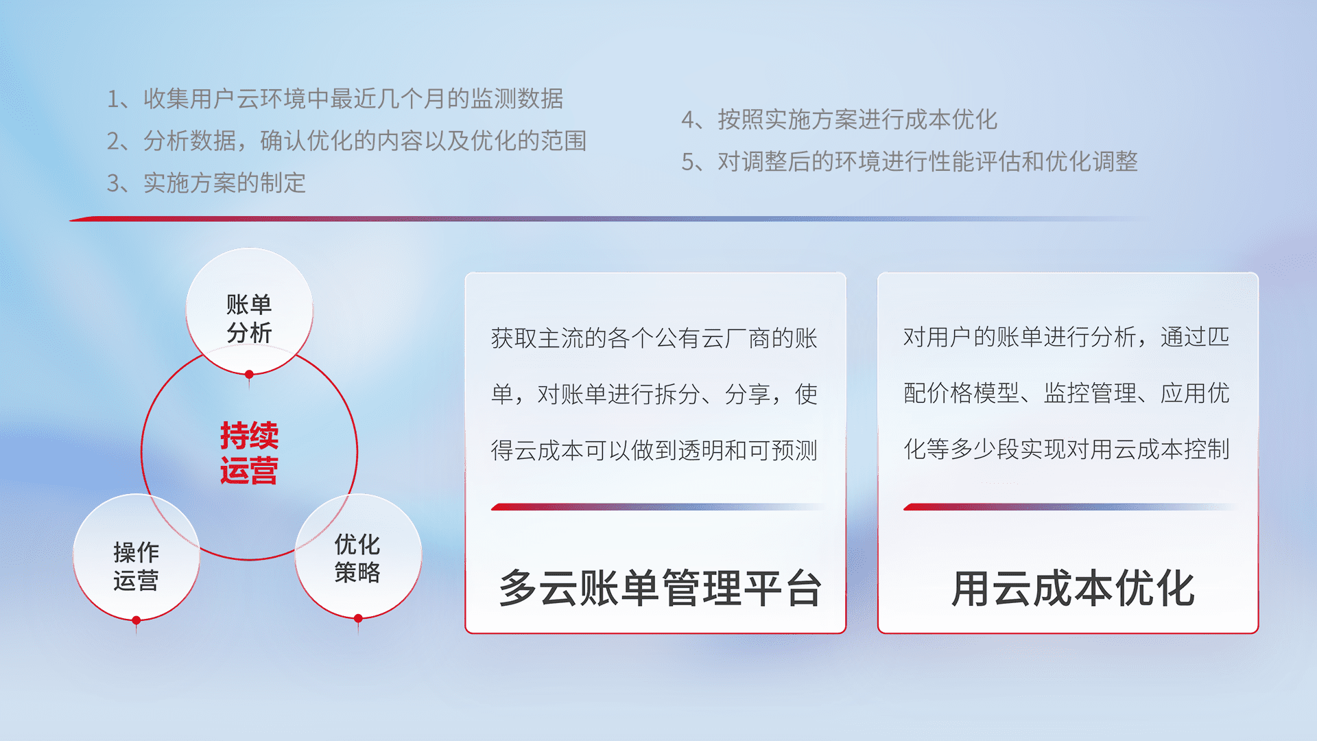 通过多云纳管,,以统一的资源数据模型把客户的云资源进行抽象和封装,,,,进而实现对多云资源的统一操作,,,保障云资源管理的可靠性、、、稳定性与可用性。。量身定制化运维内容,,配置、、、、开发运维、、补丁管理、、、备份、、、监控、、、、认证和访问管理、、审计和日常巡检等,,,,保障在用云过程中的可靠度,,,稳定度以及高可用率。。
